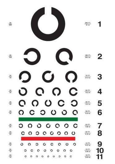 但是,需要說明的是“E表”并不是所有國(guó)家都在用。如美國(guó)現(xiàn)在還在沿用的“Snellen chart”它是由各種拉丁字母組成的,是最初版本的視力表。日本采用的蘭德特環(huán)行視力表又常被叫做“C表”。C表”也是我國(guó)飛行員,招收所所采用的標(biāo)準(zhǔn)。
