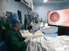 在電腦導航系統(tǒng)的準確定位下,張廣斌教授設計好手術切口位置、大小,用飛秒激光代替手術刀,進行切口和撕囊,之后將渾濁的晶體擊碎、吸除,植入散光三焦點人工晶體....