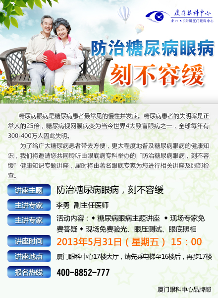 【名醫(yī)講堂糖尿病眼病防治】5月31日,本周五,糖尿病眼病防治講堂將在廈門眼科中心17樓開講,所有受糖尿病眼病疾病困擾的患者,均可來參與聽講,期間也會(huì)免費(fèi)為所有人免費(fèi)驗(yàn)光、眼底照相等檢查詳情撥打4008852777或登錄網(wǎng)站m.rongtimes.com咨詢或直接來院。