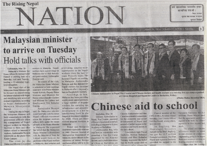 3月29日晚,中華人民共和國駐尼泊爾特命全權大使吳春太先生及夫人宴請光明行全體成員。他在宴會上發(fā)表熱情洋溢的講話。吳大使說,這次尼泊爾光明行很有意義,中尼兩國是友好鄰邦,兩國交往歷史淵源流長。這次光明行在尼泊爾北部山區(qū)的巴勒比斯舉行,這里民風淳樸,對中國有著友好的感情,但是這個地區(qū)由于道路所限,缺醫(yī)少藥,特別是一些老年人患有白內障,所以這一次光明行,對于促進兩國人民友誼,特別是解除白內障患者的痛苦具有特殊意義。另外一方面,我們之所以選擇巴勒比斯,是因為它是中尼友好之路阿尼哥公路所經過的一個重要城市,這里見證了兩國人民的千年交往史。中國政府鼓勵兩國人民開展民間友好交往,我們現(xiàn)在的外交更加積極更加全面。去年中央召開了周邊外交工作座談會,明確提出要進一步加強與周邊國家的友好關系,貫徹親、誠、惠、容的新的外交理念,鼓勵民間交往。這次活動體現(xiàn)了中央針對周邊國家外交工作的思想,體現(xiàn)了民間外交的理念。