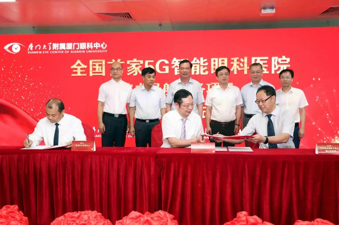 ▲廈門(mén)大學(xué)附屬?gòu)B門(mén)眼科中心董事長(zhǎng)蘇慶燦與華為移動(dòng)網(wǎng)絡(luò)數(shù)字化集成與運(yùn)營(yíng)總經(jīng)理段學(xué)鵬、中國(guó)電信廈門(mén)分公司總經(jīng)理黎樹(shù)旺正式簽約“5G智能眼科醫(yī)院”