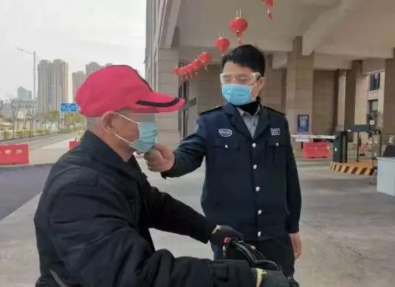 戴上護(hù)目鏡、口罩,拿起手中的額溫槍,保安在門崗為入院人員測量體溫,守好崗。