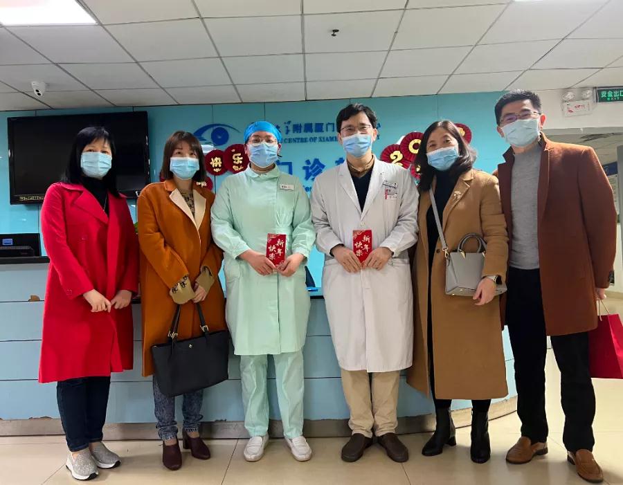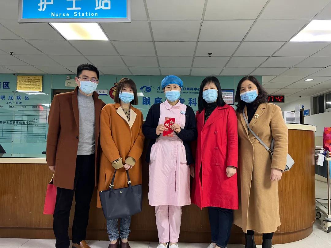 春暖大地百花艷,福滿人間萬象新。在舉家團(tuán)圓的時(shí)刻,仍有人堅(jiān)守在工作崗位。除夕當(dāng)天,廈門眼科中心執(zhí)行總經(jīng)理姚鄭玲玲、副總經(jīng)理賴瑋玲、工會主席張美嫦、人力資源部總監(jiān)石磊等院領(lǐng)導(dǎo)班子成員深入病區(qū),看望并慰問春節(jié)期間堅(jiān)守一線的醫(yī)務(wù)人員、值班后勤人員,為他們送上真切的關(guān)懷與新春的祝福。感謝他們節(jié)日期間恪守盡職,就他們在過去一年中的辛勤付出表示肯定,對疫情防控緊要關(guān)頭做出的積極貢獻(xiàn)致以崇高的敬意。